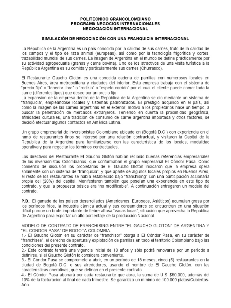 El franquiciador y el franquiciadoEs por tanto el documento que recoge con cierto detalle las condiciones de carácter jurídico económico y relacional que van a determinar las relaciones principales entre ellos. JOSE ANTONIO GRACIAS GONZÁLES de conformidad con las facultades que me confiere las leyes de la República de Guatemala y con base en el artículo cuarenta y tres. El contrato de franquicia es la plasmación del acuerdo de los dos actores intervinientes en dicha relación. El contrato de franquicia es aquel en el que una parte denominada franquiciador cede a otra denominada franquiciado el derecho a la explotación comercial de sus métodos y procedimientos a cambio de una contraprestación económica. En el contrato de franquicia quedan por escrito los principales puntos de la relación entre ambas partes además de establecer por ejemplo las cuotas o el pago por el derecho a tener esa franquicia. Franquicia de Servicios figura por la cual el franquiciante desarrolla servicios usando el nombre comercial o la marca del franquiciante que son prestados por el franquiciatario basándose en lo estipulado en el Contrato de Franquicia a sus clientes.