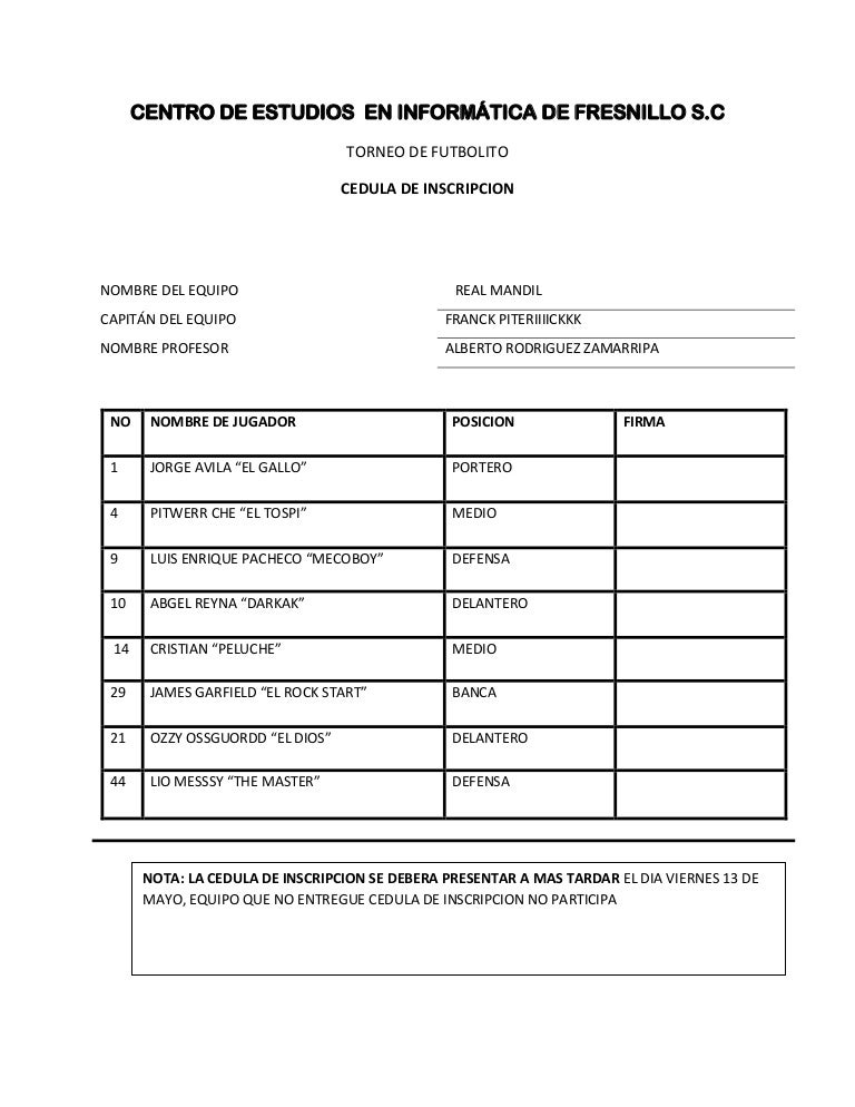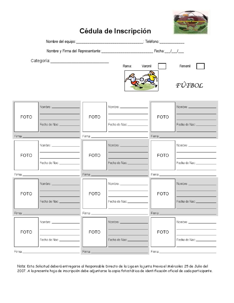 La Cédula de Inscripción. Si usted es el gerente o el entrenador de un equipo de fútbol baloncesto o softbol puede recopilar sin problemas detalles de contacto pagos de tarifas y firmas de los padres en línea a través de nuestros formularios gratuitos. Licenciadasos en Entrenamiento Deportivo laslos Profesores de grupo yo Directivos quienes deberán contar con autorización por escrito del Secretario Ejecutivo de CONDEBA de cada Estado para participar en estos juegos y estar registrados en el programa de la Capacidad Funcional de su Estado. TEMPORADA IV 2017 DE LIGAS DE FÚTBOL EN EXTERIORES PARA ADULTOS Formulario de Inscripción Por favor llena el siguiente formulario y envíalo por correo o fax con tu pago a. AUTOSERVEF GVA Labora. Es un documento impreso que se dota al extranjero que no puede ser documentado por las autoridades de ningún país y que desea ser documentado por España una vez se haya resuelto su inscripción en el Registro Central de Extranjeros.