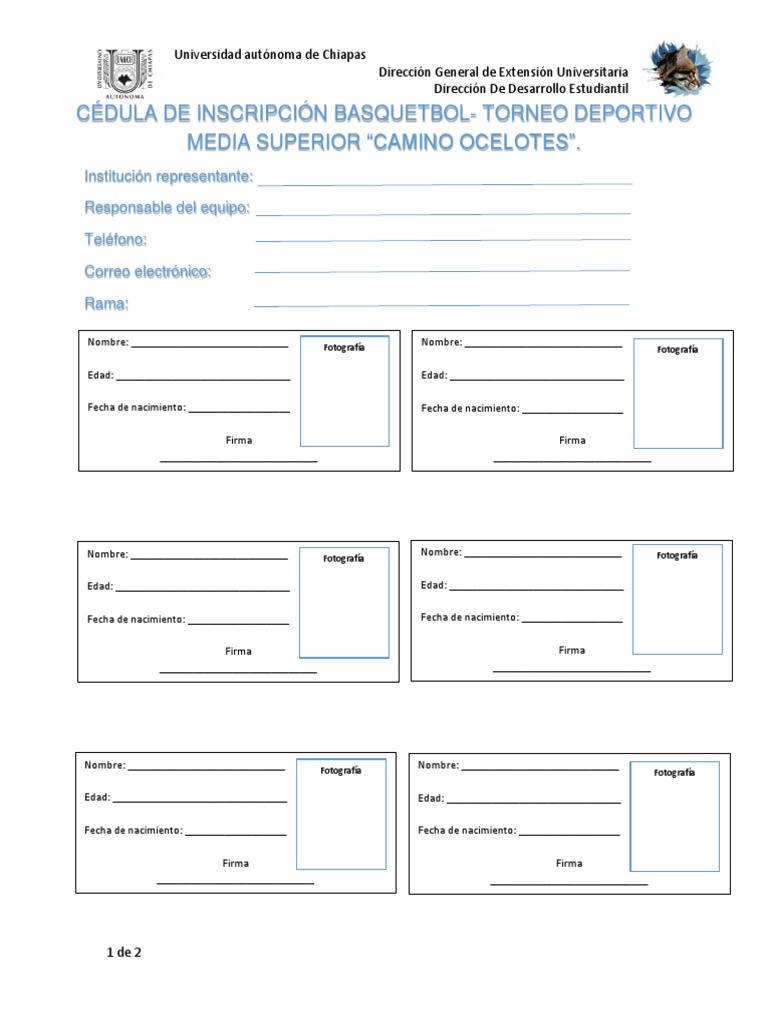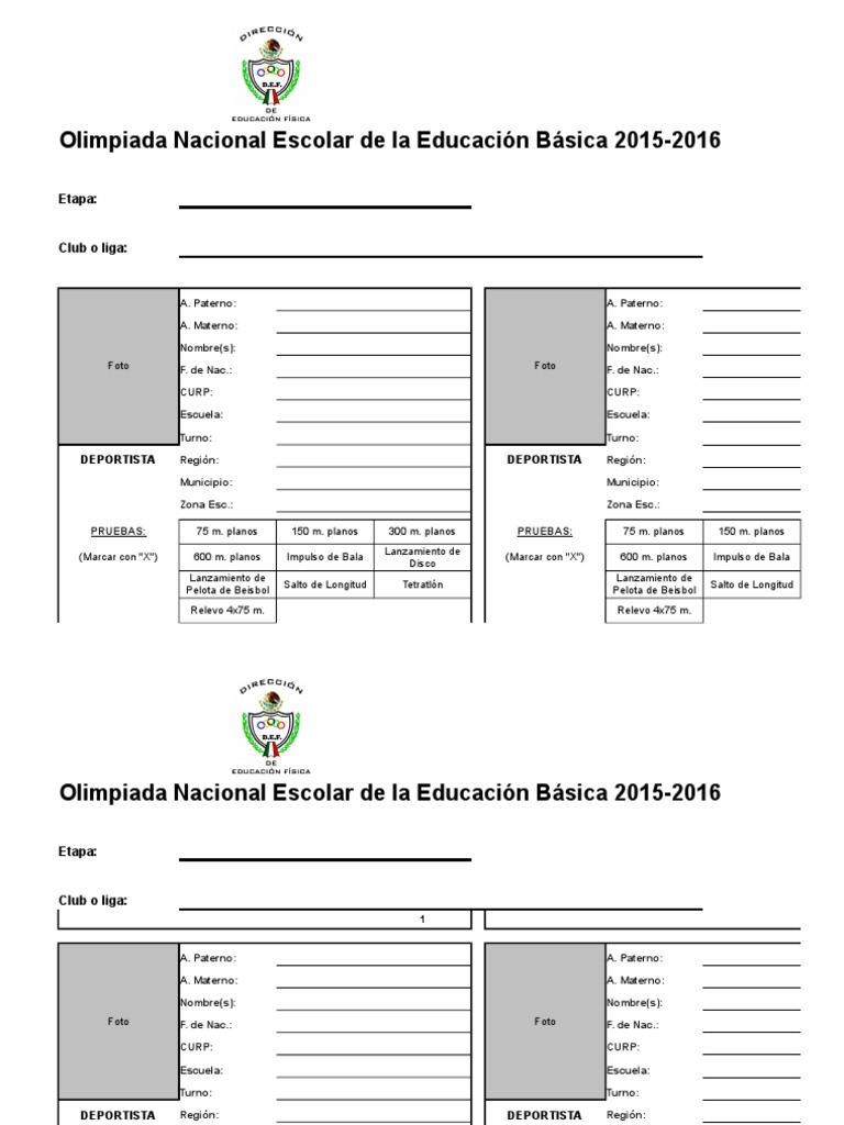 Cedula de inscripcion deportiva - Registro Nacional de Información PenitenciariaCédula Única de Identificación Personal NINGUNA 1 ECLESIÁSTICA OTRA 3 7 POLITÍCA SOCIAL DEPORTIVA 1 5 2 6 CULTURAL CIUDADANA 4 TIPO. 7 de julio de 2021. Copia de Convocatoria de Futbol. Documento identificativo expedido por las autoridades españolas en aquellos casos en los que la persona nacional de un país extranjero no puede ser documentada con pasaporte por su país de origen. AQUÍ ESTÁN LAS CONVOCATORIAS DEPORTIVAS ASÍ COMO LAS CÉDULAS DE INSCRIPCIÓN Y LA RESPONSIVA PARA LOS EVENTOS DE ZONA. 6 Formatos Mini Voleibol Condeba.