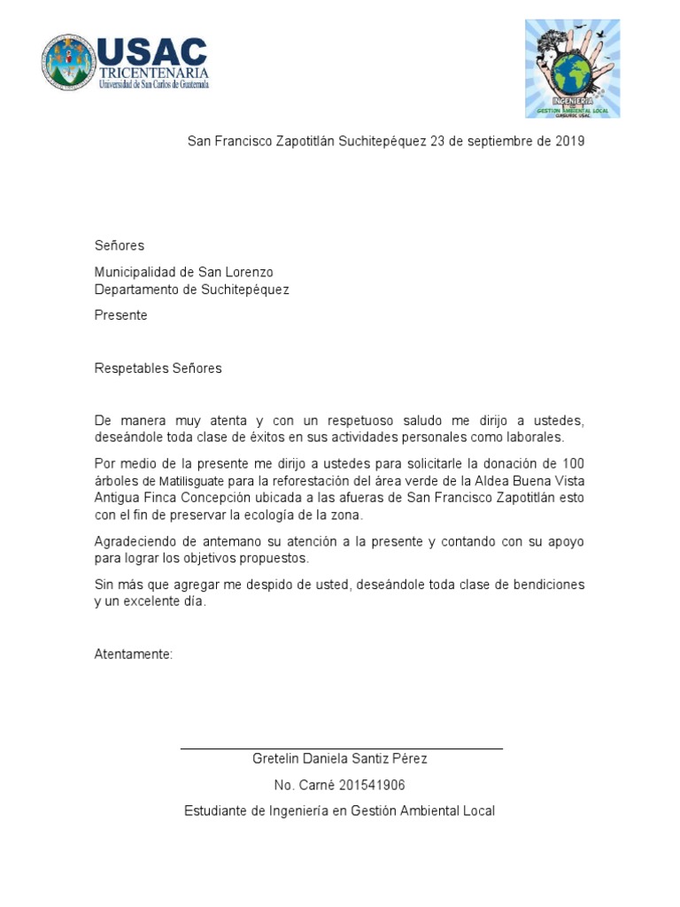 Ingresar la solicitud vía escrito dirigido al Director de Medio Ambiente a través de la Oficialía Común de Partes del Ayuntamiento de Atizapán de Zaragoza o en las Oficinas de la Dirección de Medio Ambiente. 3 Cómo escribir una carta al presidente del municipio en inglés. El que suscribe con la firma del presente documento manifiesto que he sido informado del correcto uso trato y recolección de mis. La dependencia de la Adminsitración Pública Federal encargada de atender lo relativo al tema forestal es la Comisión Nacional Forestal CONAFOR por lo que deberá remitirse a dicha dependencia para ver si tienen árboles en existencia para proyectos de reforestación. Modelo de carta para solicitar donación de árboles en línea. Es necesario que incluyas en la carta todos los datos de contacto tuyos para que puedan avisarte si se aprueba tu solicitud números de teléfono blog página de Facebook dirección particular y correo electrónico.