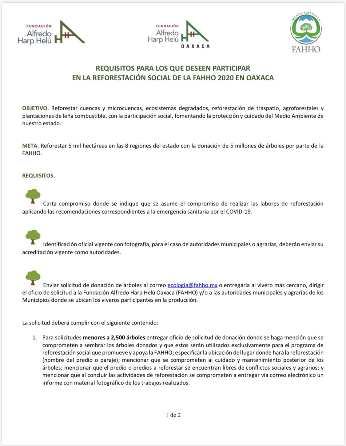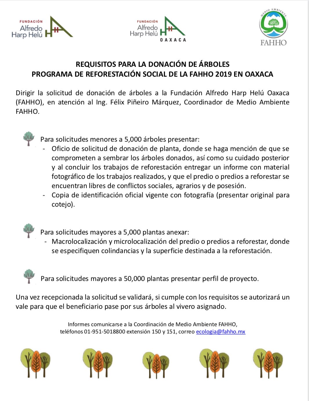 Microsoft Word - Catalogo de servicios DMEDyPA 2018 Author. Esta solicitud la puedes entregar. 2 Indicar en el escrito. 11152018 124317 PM. Se solicita la entrega de árboles para plantación en espacio privado o institucional y la respectiva asesoría manifiesta que garantizará los recursos requeridos mano de obra disposición de escombros y el mantenimiento del arbolado e indica la dirección del lugar donde se espera desarrollar el proceso de plantación. Dirigir el oficio de solicitud a la Fundación Alfredo Harp Helú Oaxaca FAHHO yo a las autoridades municipales y agrarias de los municipios donde se ubican los viveros participantes en la producción.