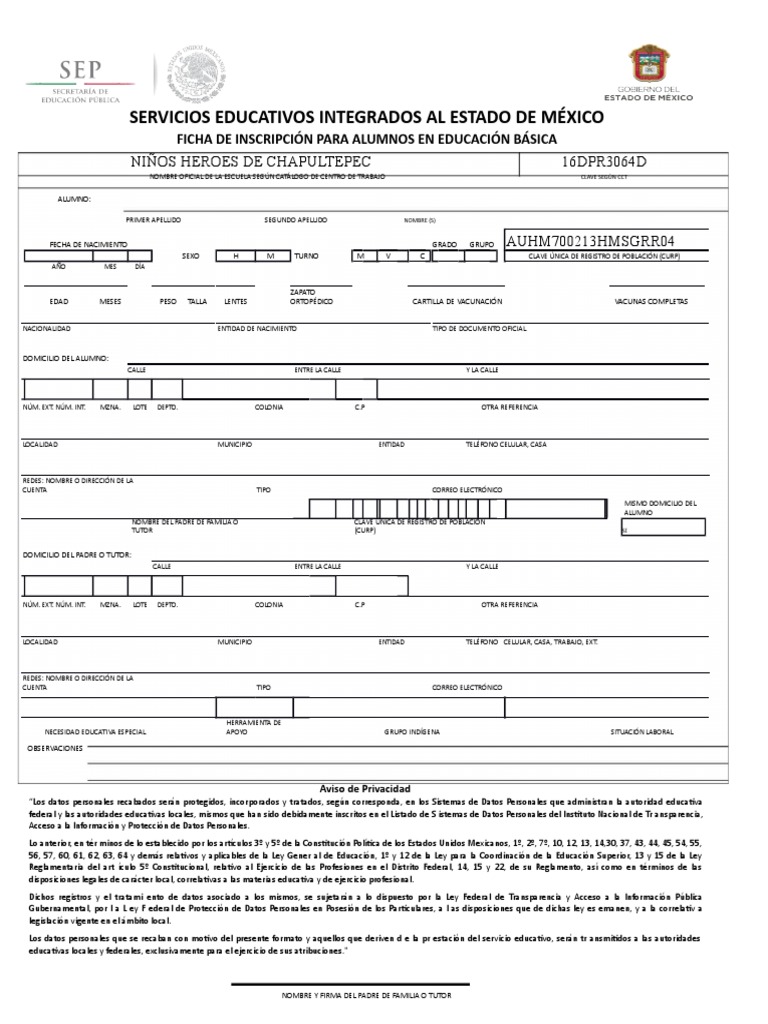 Ficha de inscripción impresa con los datos completos rellena con tinta azul original y incluir dos números de contacto Contar con seis años cumplidos al 31 de diciembre del año de inicio del ciclo escolar 2021-2022. Fecha de nacimiento grado grupo clave Única de registro de poblaciÓn curp sexo turno m alumno primer apellido segundo apellido nombre s servicios educativos integrados al estado de mÉxico ficha de inscripciÓn para alumnos en educaciÓn bÁsica nombre oficial de la escuela segÚn catÁlogo de centro de trabajo clave centro de trabajo. Fecha y Lugar Nacimiento. NOMBRE O DIRECCIÓN DE LA. Solicitudes de inscripción de alumnas y alumnos de Educación Básica. Para aspirantes de nuevo ingreso a nivel de Preescolar será mediante el acceso a la página wwweducacionbcedumx a través de la clave CURP o CRIP que aparece en el acta de nacimiento.