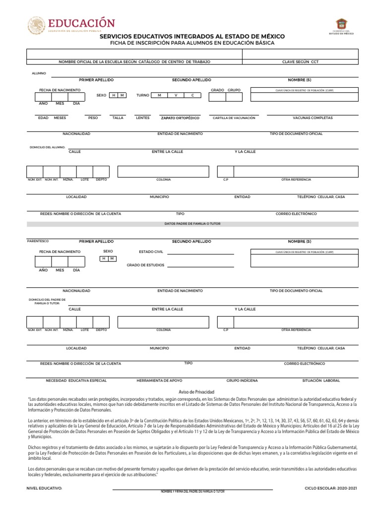 Este documento esta en un formato PDF para que pueda ser descargado e impreso fácilmente. La ficha de inscripción es un documento que se utiliza para recopilar información personal como. Recuerda que a partir del 1 de diciembre y hasta el 31 de agosto del siguiente año estará disponible la información del proceso de pre-inscripciones a escuelas públicas de educación básica en el portal de la Autoridad Educativa Federal en la Ciudad de México AEFCM. Las etapas serán según el siguiente calendario. - Consta de tres grados. SERVICIOS EDUCATIVOS INTEGRADOS AL ESTADO DE MÉXICO FICHA DE INSCRIPCIÓN PARA ALUMNOS EN EDUCACIÓN BÁSICA.