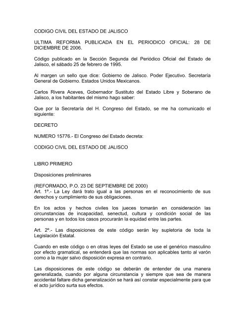 Codigo civil del estado de jalisco 2018 - Ver exposiciones de motivos. Jalisco el sábado 25 de febrero de 1995. Congreso del Estado se me ha comunicado el siguiente. Gobierno del Estado Publisher. CODIGO CIVIL DEL ESTADO DE JALISCO. EVERARDO TOPETE Gobernador Constitucional del Estado Libre y Soberano de Jalisco a los.