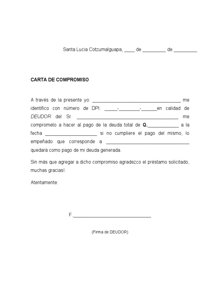 El respectivo membrete donde se identifica al remitente. Quien e puede ayudar necesito hacer Una carta de compromiso de pago y mencionar el numero de medidor que responderá por el servicio pero no tengo ni las remota idea de como hacerla va hacer para poner un medidor en un privada si me ayudan por favor. Lo que debes considerar para realizar un pagaré o promesa de pago. La carta de compromiso de pago es muy utilizada en el ámbito crediticio. Provee una renovación del compromiso de pago lo cual es importante cuando has caído en morosidad. Seguramente te preguntarás la diferencia entre una carta compromiso de pago y un pagaré si eso te sucede entonces lo único que debes de saber es que las diferencias son prácticamente mínimas lo único que cambia es que como tal dentro del texto de un pagaré se incluye el verbo pagaré y en la carta compromiso se incluye dentro de la redacción del texto sin que tenga.