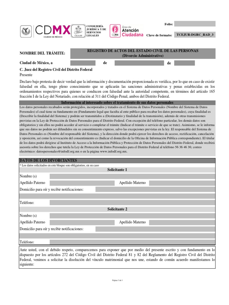 Formato divorcio administrativo cdmx - Tramite hoy su Divorcio Express CDMX. Tamaño 2 a 3 páginas. REGISTRO DE ACTOS DEL ESTADO CIVIL DE LAS PERSONAS NOMBRE DEL TRÁMITE. Formato de Solicitud TCEJUR-DGRC_RAD_1 debidamente requisitado. Los requisitos para el divorcio administrativo son los siguientes. Convenio de divorcio.