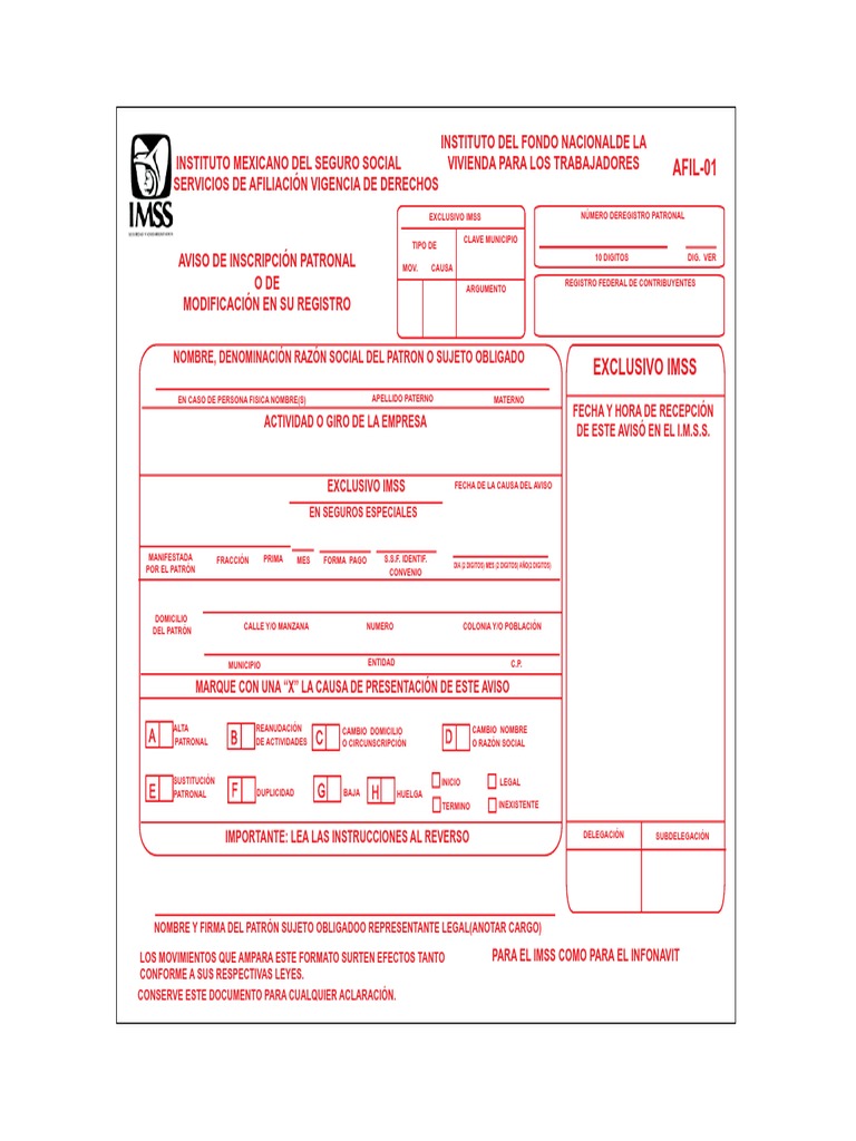 Formato de inscripcion patronal - Manual de aplicación y casos prácticos de Seguridad Social. El IMSS publica nota aclaratoria del formato de inscripción patronal o de reanudación e actividades Afil 01-A - Régimen obligatori - Id. Anotar la fecha de nacimiento con el formato día mes y año. Visto Bueno de Seguridad y Operacion. Opcional c-reanudaciÓn de actividades. Afil 03 AVISO DE MODIFICACIÓN DEL SALARIO DEL TRABAJADOR guest99293d.