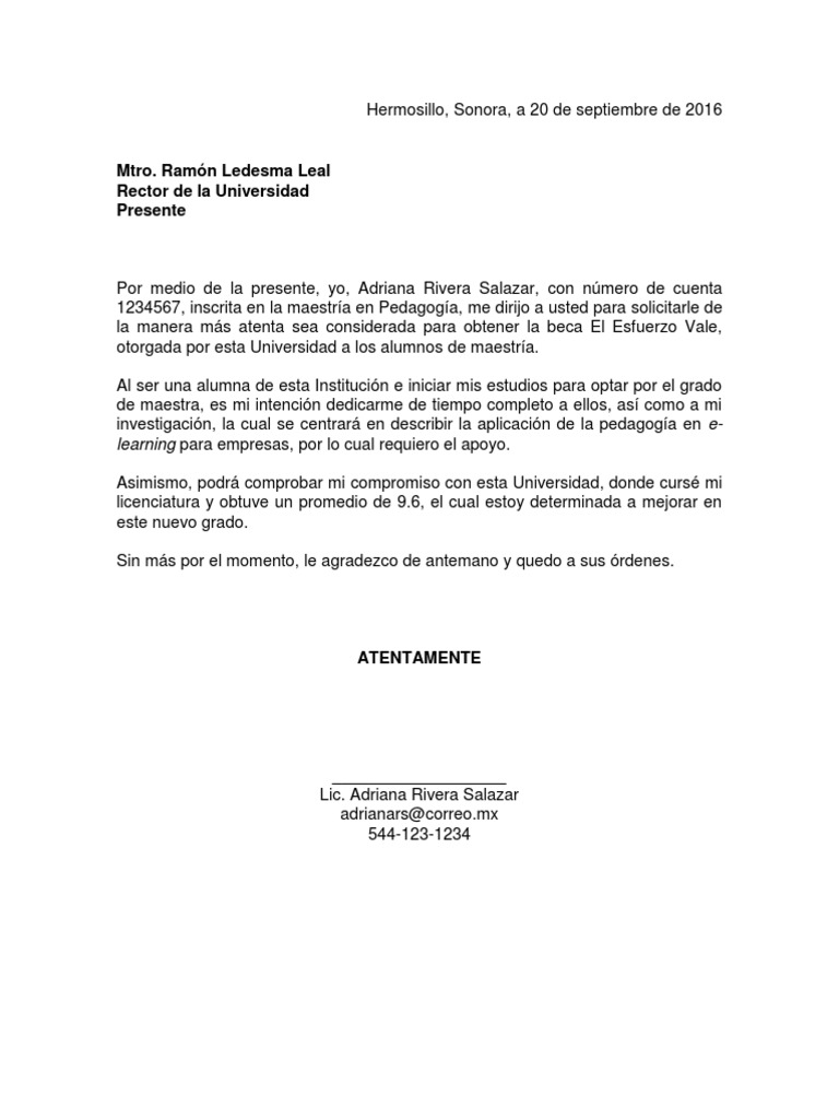 Por este medio me atrevo a solicitar formalmente una beca para la realización de mis estudios de Licenciatura en la Universidad Tecnológica del Occidente. El máster en la prestigiosa universidad parecía un paso lógico tanto en términos de perspectivas de carrera. Ya sea para ingresar en una Universidad o para aplicar a sus becas las instituciones universitarias acostumbran a solicitar una carta de exposición de motivos para Maestría donde debes argumentar por qué debes ser admitido o agraciado con una ayuda al. La carta para solicitar una maestría es un documento donde se expresan los motivos del solicitante para ingresar en esa maestría. Errores comunes en carta para solicitar una beca Si es la primera vez que escribes una carta de motivación es probable que cometas algunos errores. Esta carta debe motivar al lector y convencerlo de que realmente mereces obtener esta beca.
